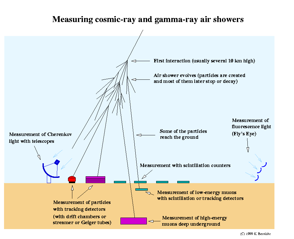 A cosmic ray impacting the atmosphere a shower of secondary particles which are very extensive for high energy cosmic rays. Ultra high energy cosmic rays are detected by observing the fluorescence emissions from nitrogen molecules in air and the shower extends to the ground where particles can also be detected. Due to sun, moon and weather, fluorescence telescopes are usually limited to an about ten percent duty cycle.
